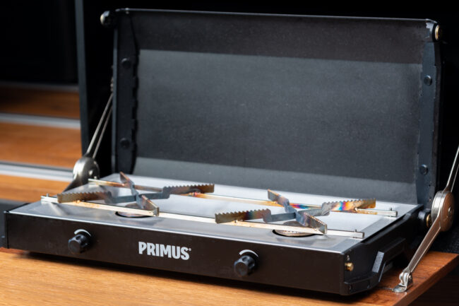 Outdoor auf Klapp-Grillstation mit 2-flammigem Primus-Kocher und Tischfunktion