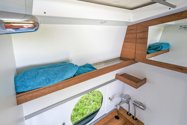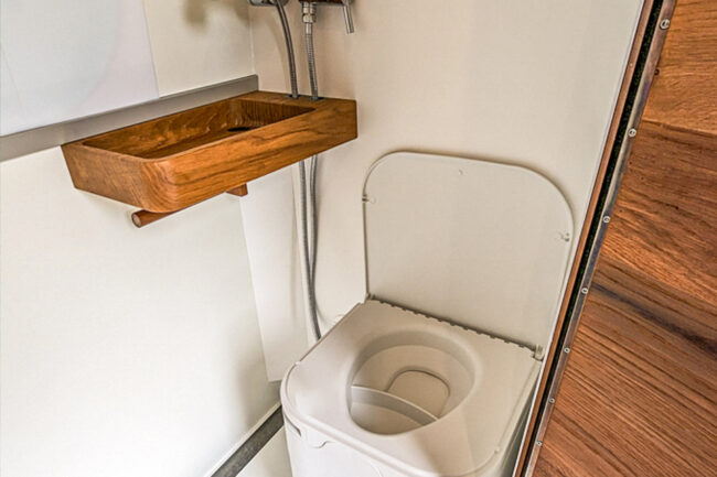 Abgetrennte Badkabine: Exklusives Duschvergnügen inkl. Toilette, selbst bei einer Fahrzeuglänge von nur 6 Metern.