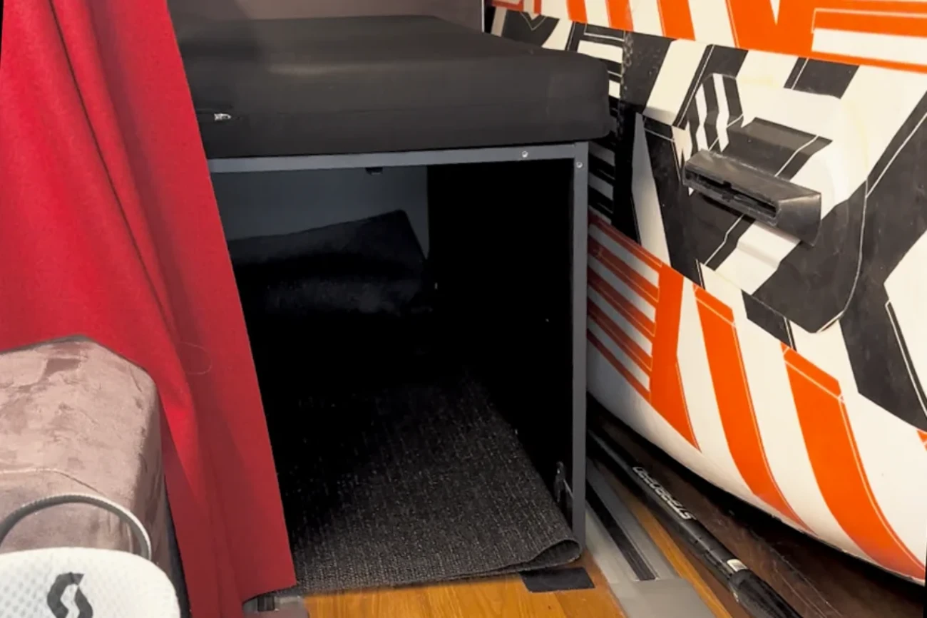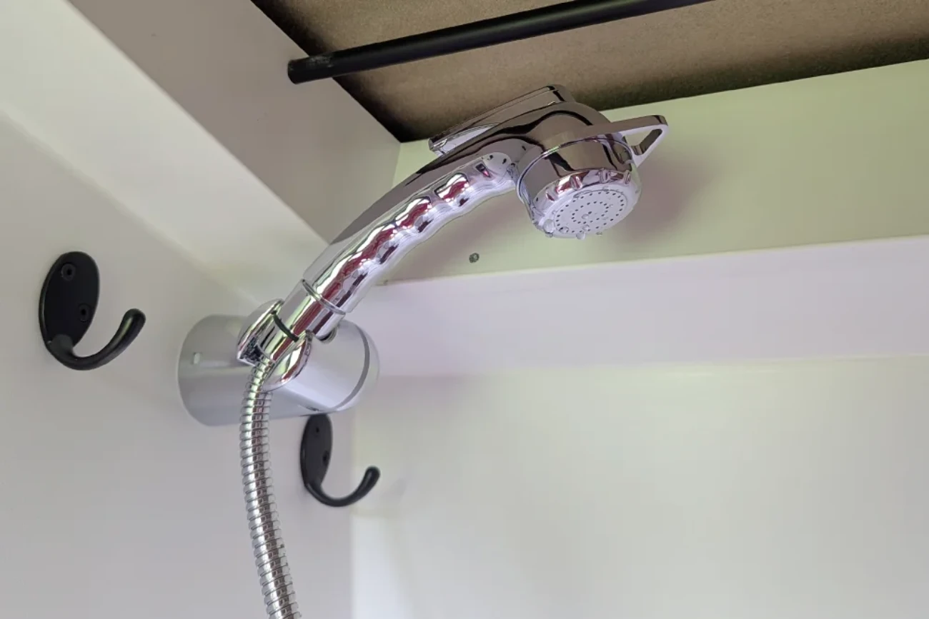 Du wünscht dir großzügigen Platz im Camper? Wir bieten als Alternative zur Kabine unsere Flexdusche an. Die Duschbox ist mit Duschschlauch und Vorhang ausgestattet und ist gleichzeitig großzügiger Stauraum mit gepolsterter Sitzgelegenheit.