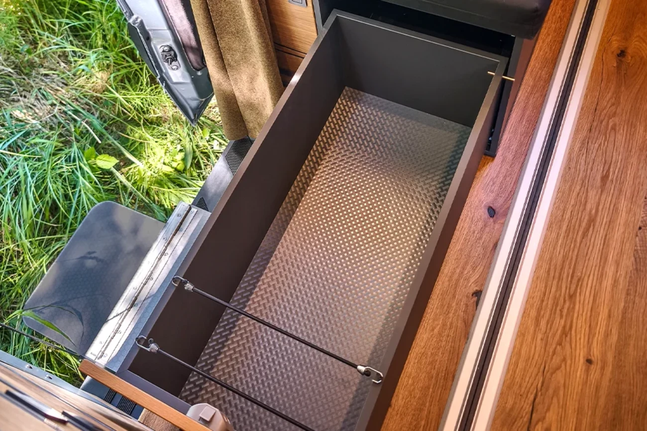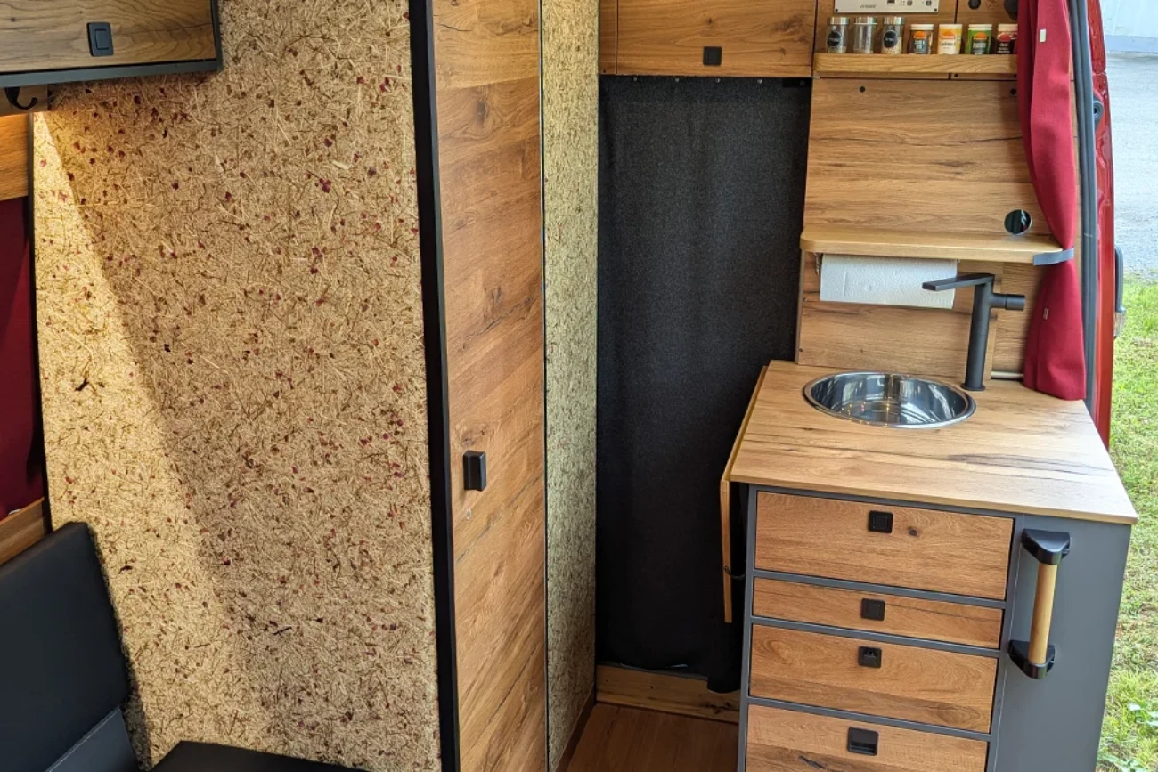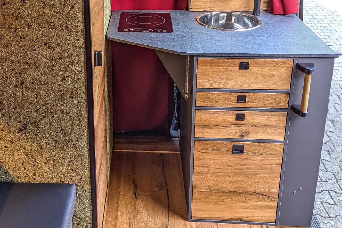 · VanEssa Modulbox als Erweiterung zur Küche mit integriertem Induktionskochfeld. Als Alternative zum Durchgang ins Fahrerhaus ist diese ausgestattet mit zwei großen, stabilen Schubkästen. Der untere Auszug kann u. a. für eine Camping-Toilette vorbereitet werden.