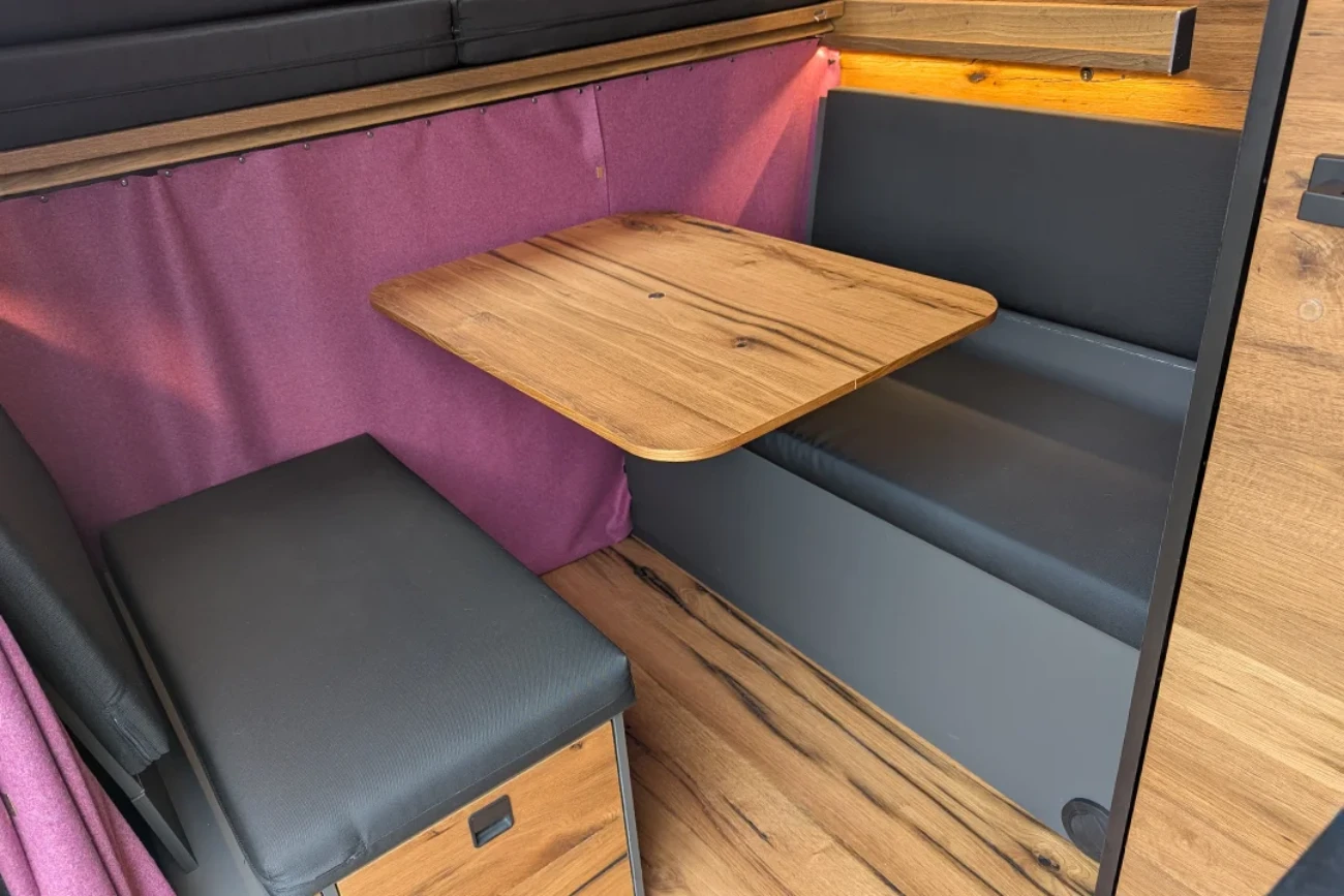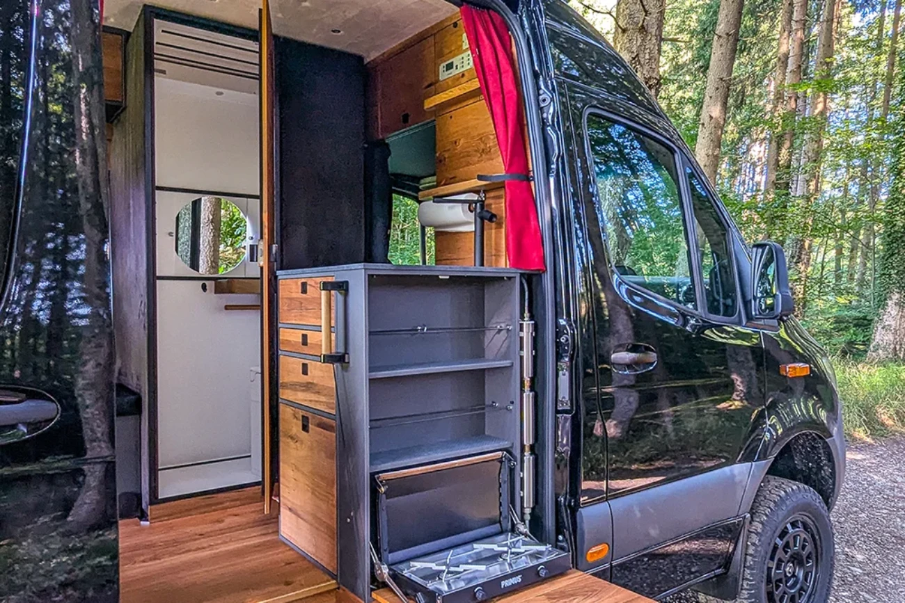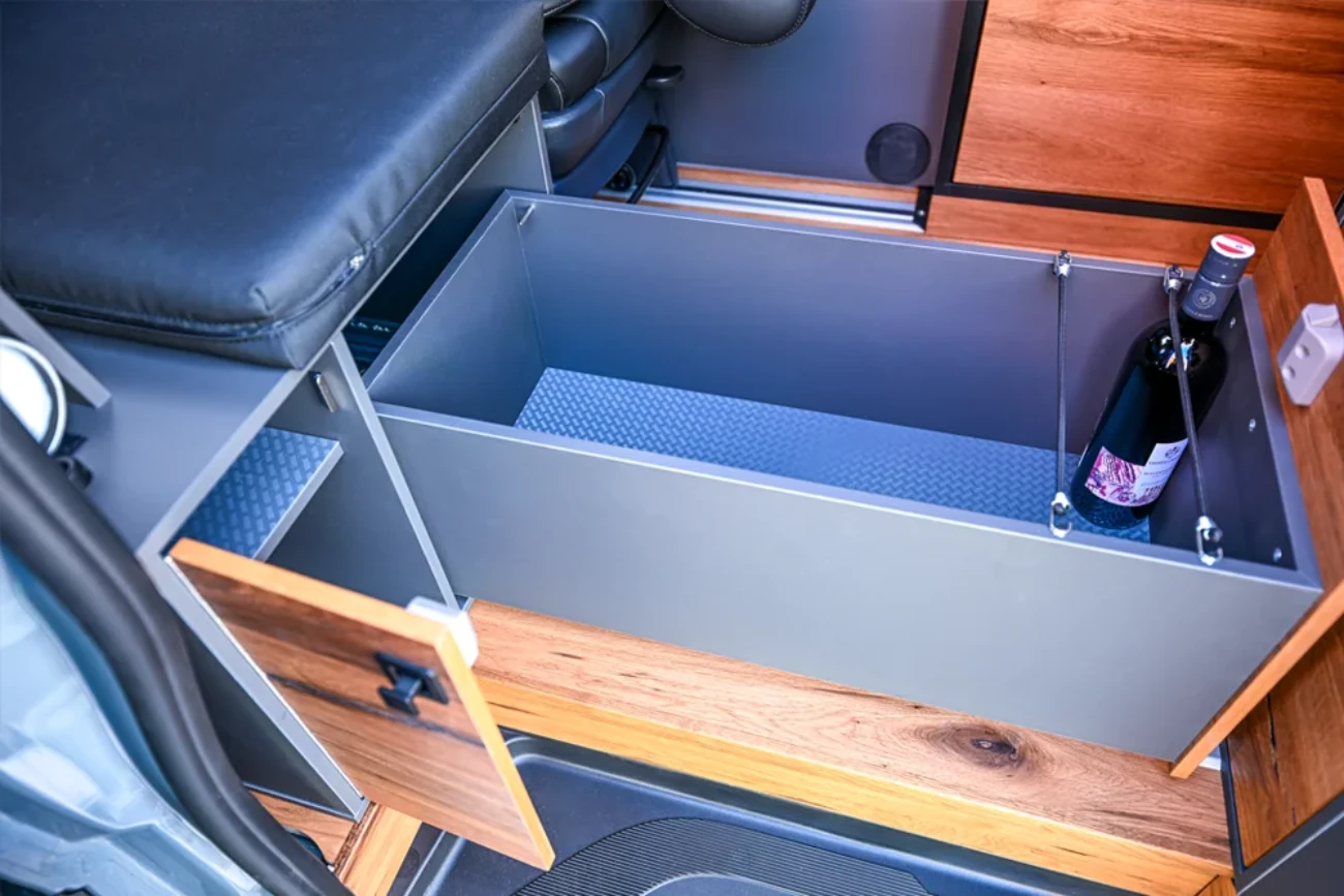 · VanEssa Modulbox als Erweiterung zur Küche mit integriertem Induktionskochfeld. Als Alternative zum Durchgang ins Fahrerhaus ist diese ausgestattet mit zwei großen, stabilen Schubkästen. Der untere Auszug kann u. a. für eine Camping-Toilette vorbereitet werden.