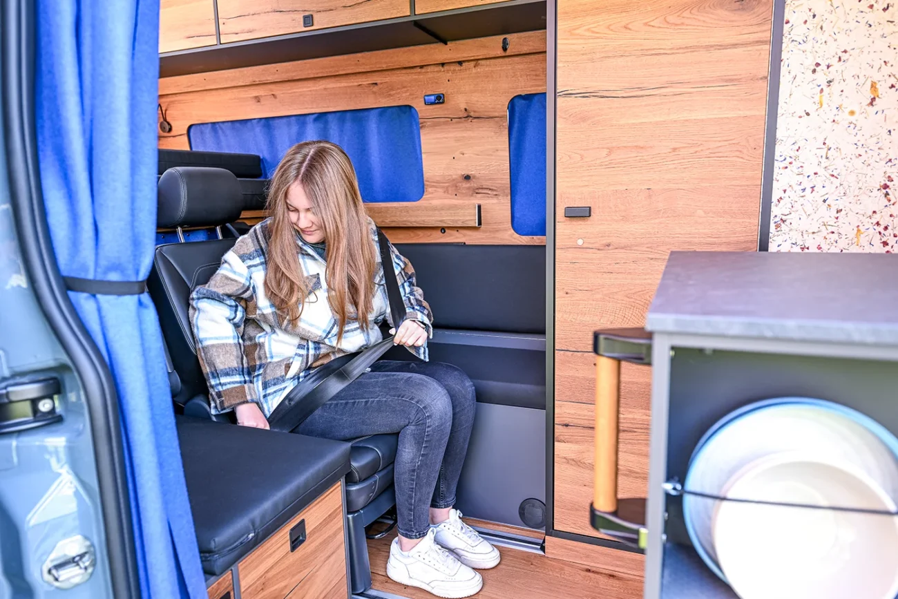 Wenn du Schlafplätze auf zwei Ebenen wünscht, verlegen wir ein Volkswagen Schienensystem im Fahrzeug-Boden. In der Regel verbauen wir die Original Dreierschlafbank eines VW T5/T6 Multivan/Beach. So wird aus deinem Campervan ein Fünf-Sitzer und es entsteht gleichzeitig eine zweite Liegefläche. Für Family & Friends ideal. Je nach Bedarf bieten wir alternativ im unteren Bereich auch 1 – 2 Einzelbetten an als Zusatzbetten.