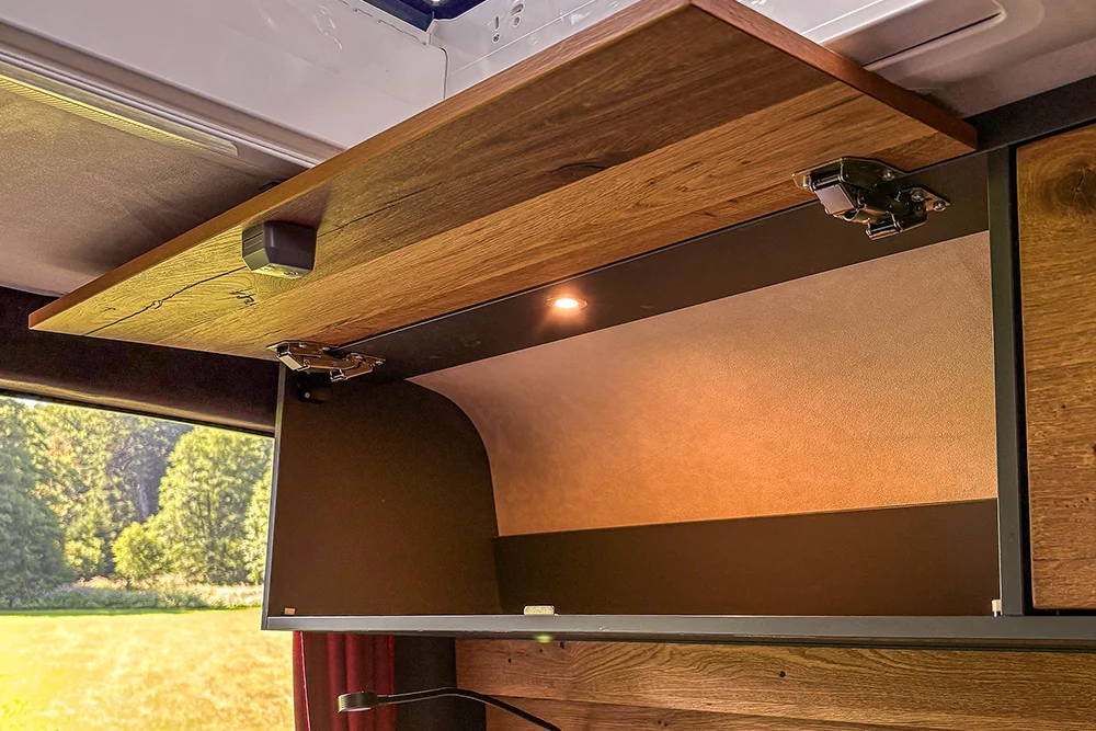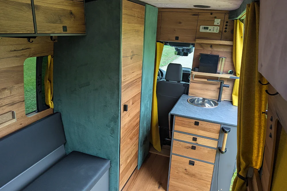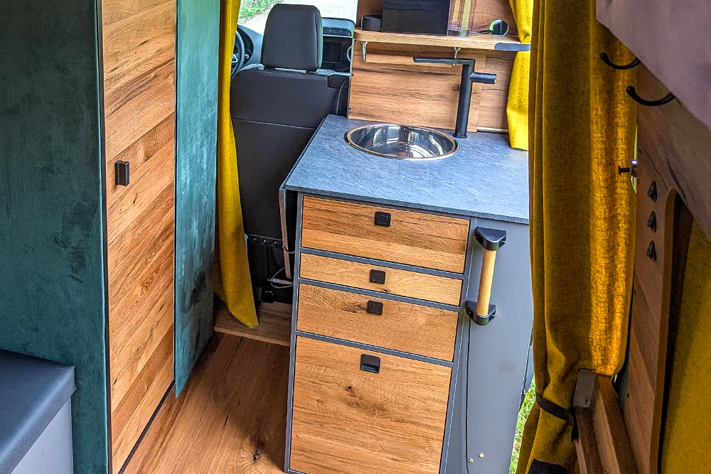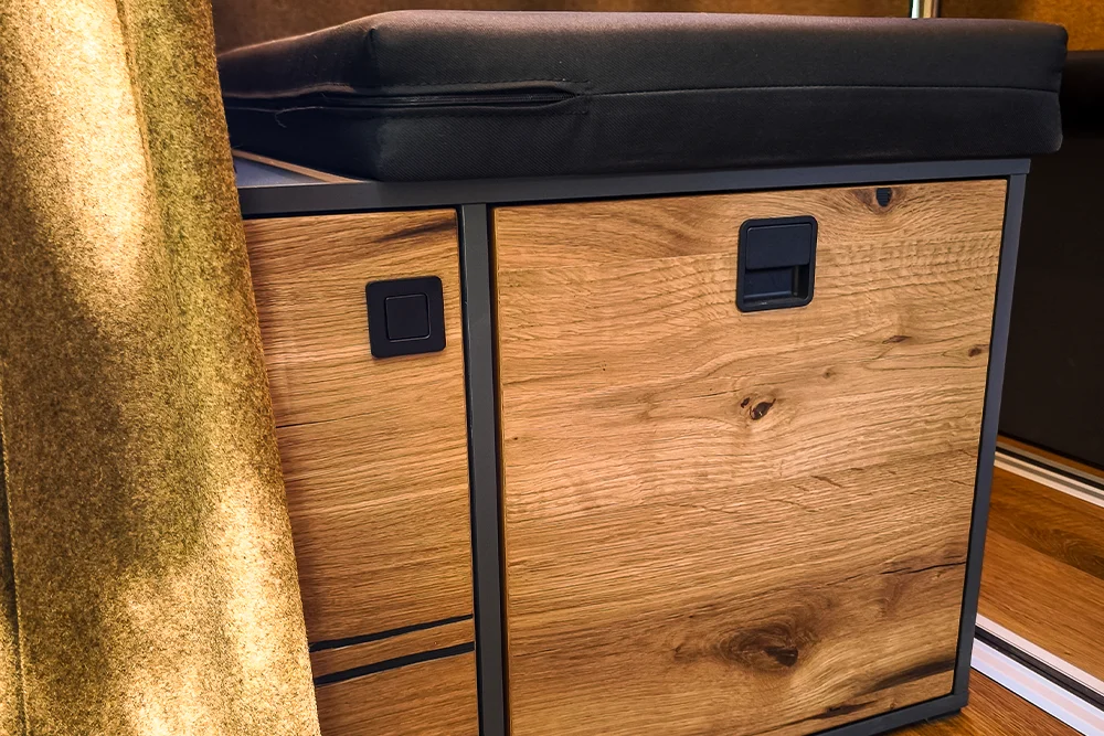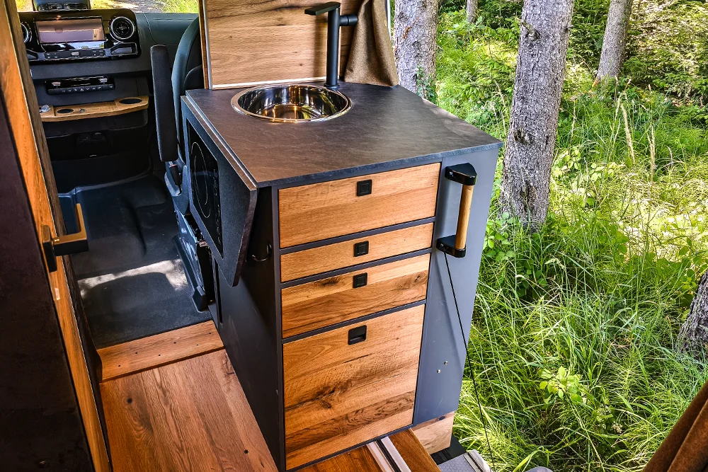 · VanEssa Modulbox als Erweiterung zur Küche mit integriertem Induktionskochfeld. Als Alternative zum Durchgang ins Fahrerhaus ist diese ausgestattet mit zwei großen, stabilen Schubkästen. Der untere Auszug kann u. a. für eine Camping-Toilette vorbereitet werden.