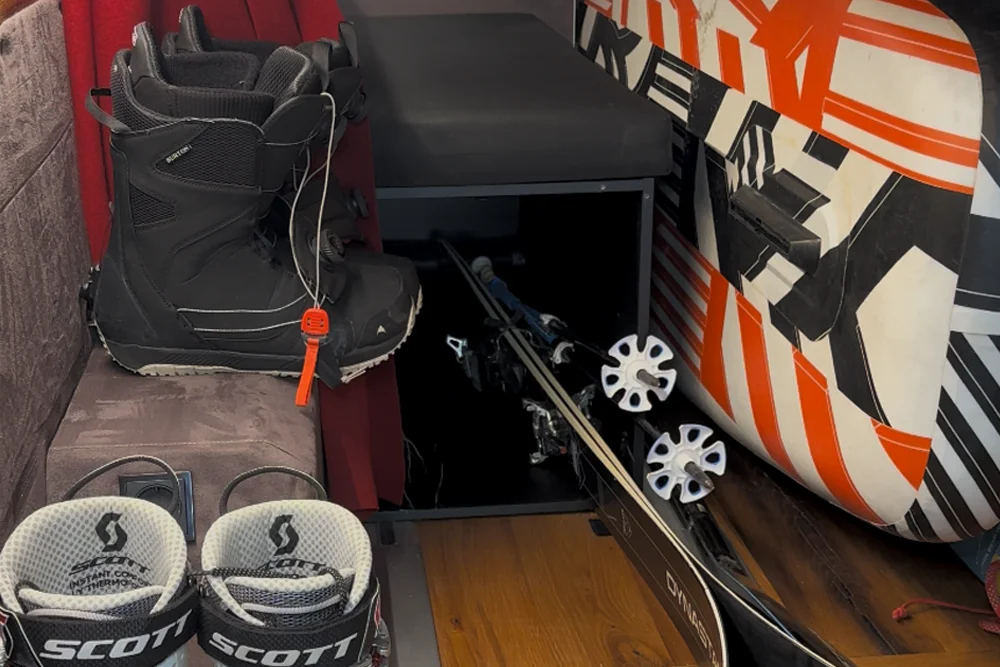Du wünscht dir großzügigen Platz im Camper? Wir bieten als Alternative zur Kabine unsere Flexdusche an. Die Duschbox ist mit Duschschlauch und Vorhang ausgestattet und ist gleichzeitig großzügiger Stauraum mit gepolsterter Sitzgelegenheit.